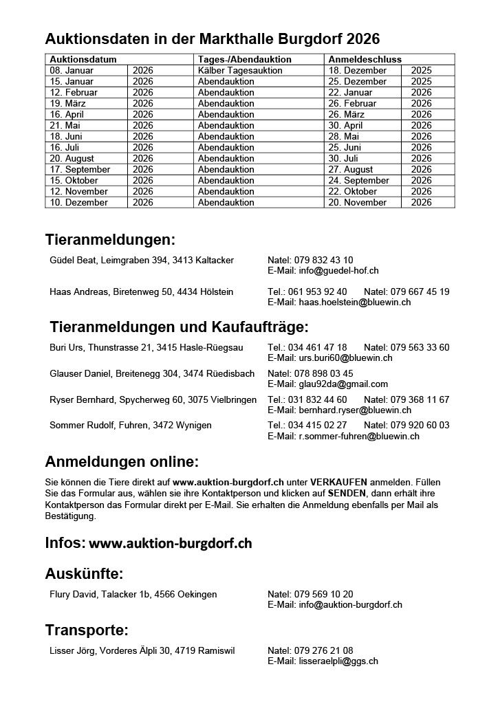 Die Auktionen werden als Abendauktion durchgeführt. Der Auktionsbeginn ist 20:00 Uhr, Besichtigung ab 19:00 Uhr. Der Tiertransport erfolgt anschliessend an die Auktion oder am nächsten Morgen. Anfangs Januar findet eine Kälberauktion statt, mit Auktionsbeginn 11:00 Uhr, Besichtigung ab 10:00 Uhr.